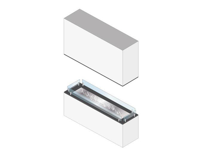 Il caminetto Foco Four è composto da una piastra di base con un'apertura per il bruciatore a bioetanolo e da una piastra superiore che può essere fissata sul lato inferiore di una parete flottante.